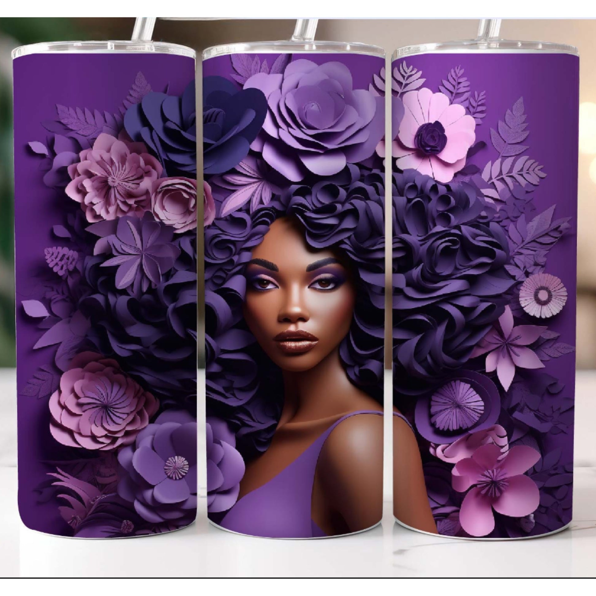 Afro Woman 3D 20oz Stainless Steel double wall insulated tumbler with lid and stainless steel straw. Keeps drinks cold for 12 hours and hot for 8 hours.