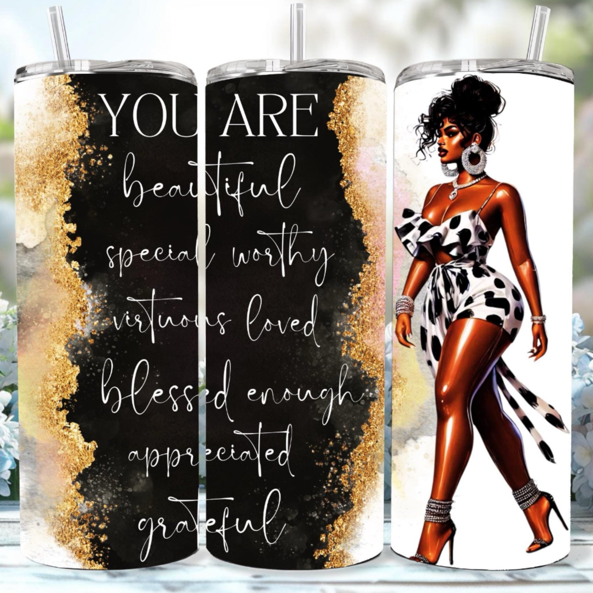 Black Queen Affirmation Tumbler 3D Tumbler. 20oz Stainless Steel double wall insulated tumbler with lid and straw. Keeps drinks cold for 12 hours and hot for 8 hours.