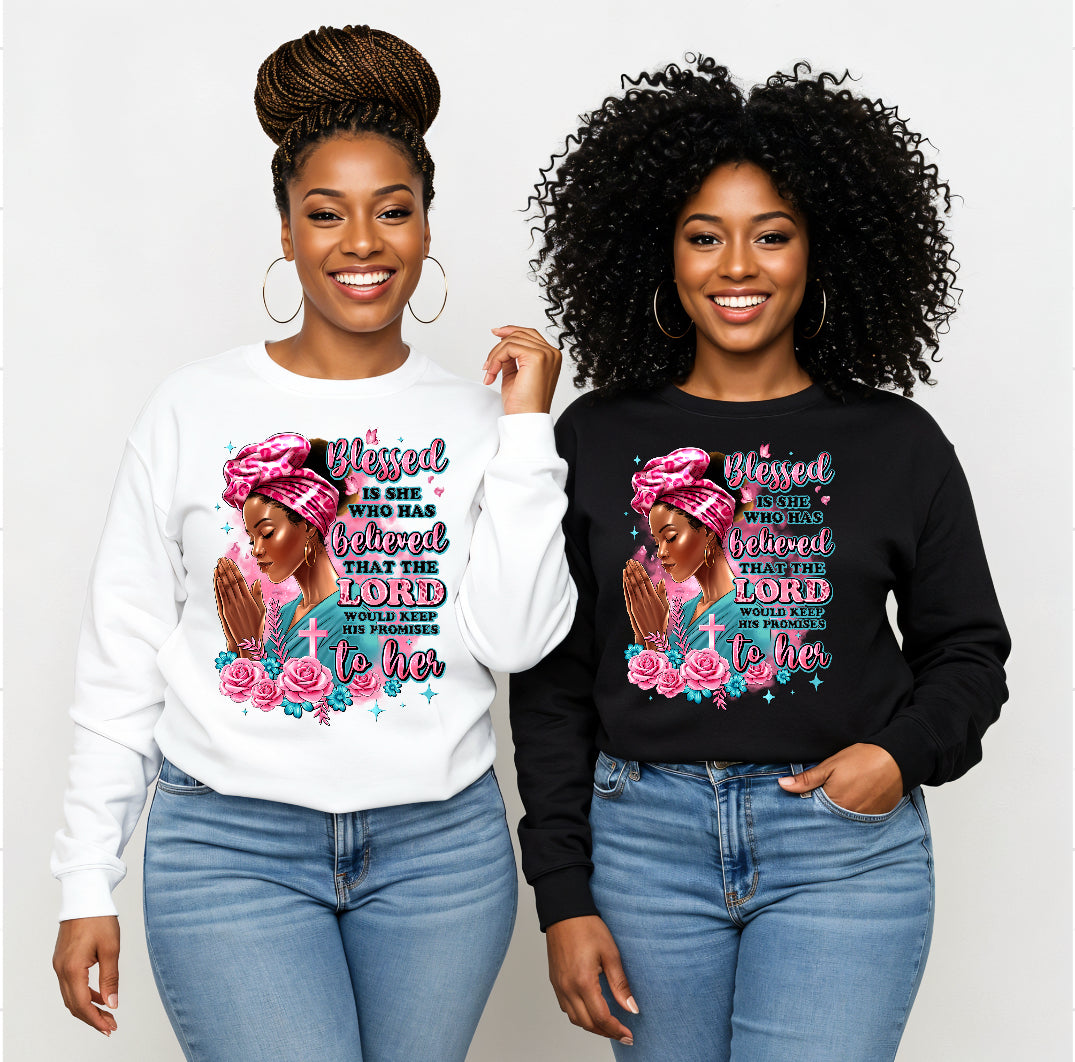 Blessed Is she Sweater customized using Gildan brand Adult Heavy Blend Fleece Crew offers ultimate comfort and durability. Crafted from a 50/50 blend of cotton and polyester, this 8 oz. fleece crew features a tear-away label, pill-resistant air jet yarn, and double-needle stitching. Available in black or white color.