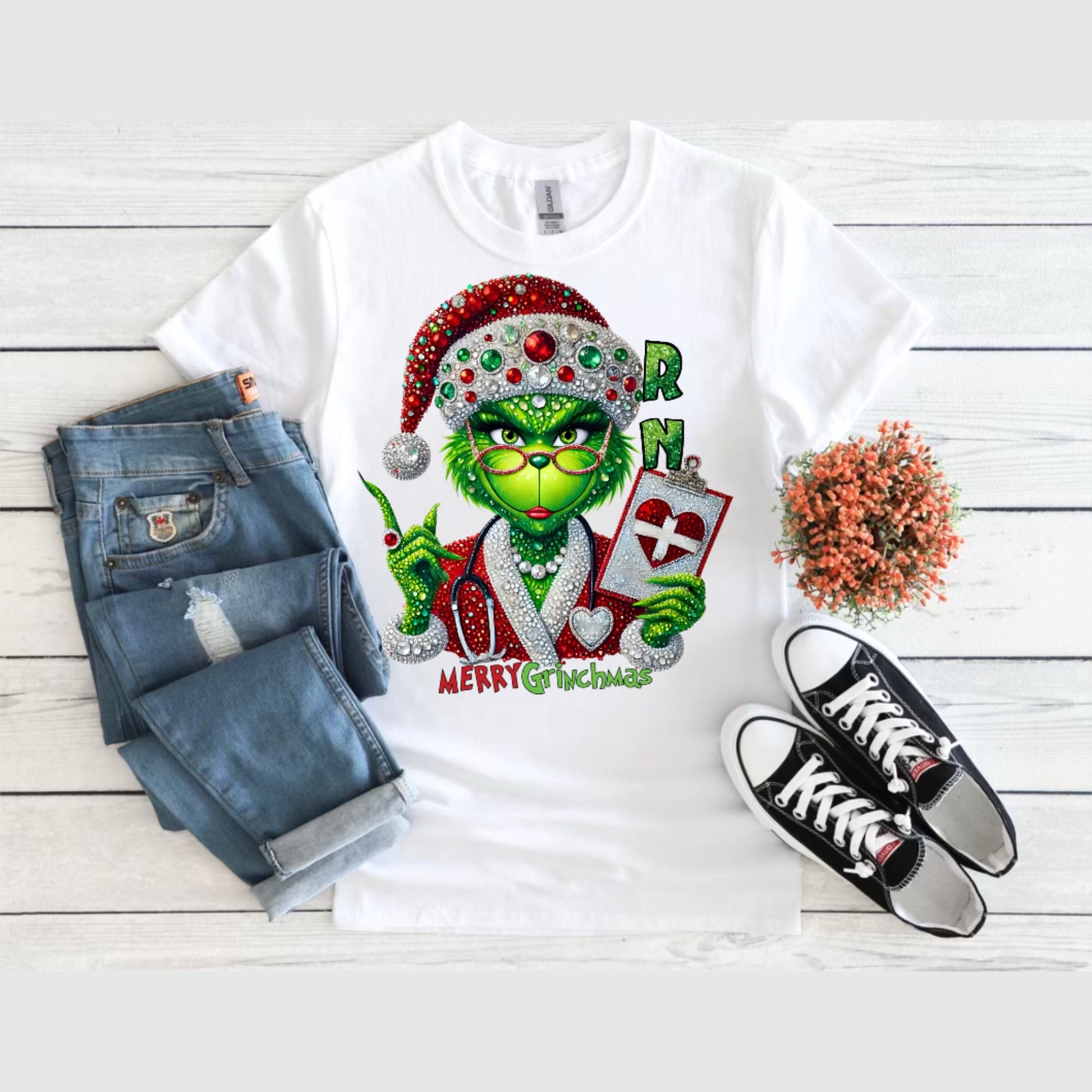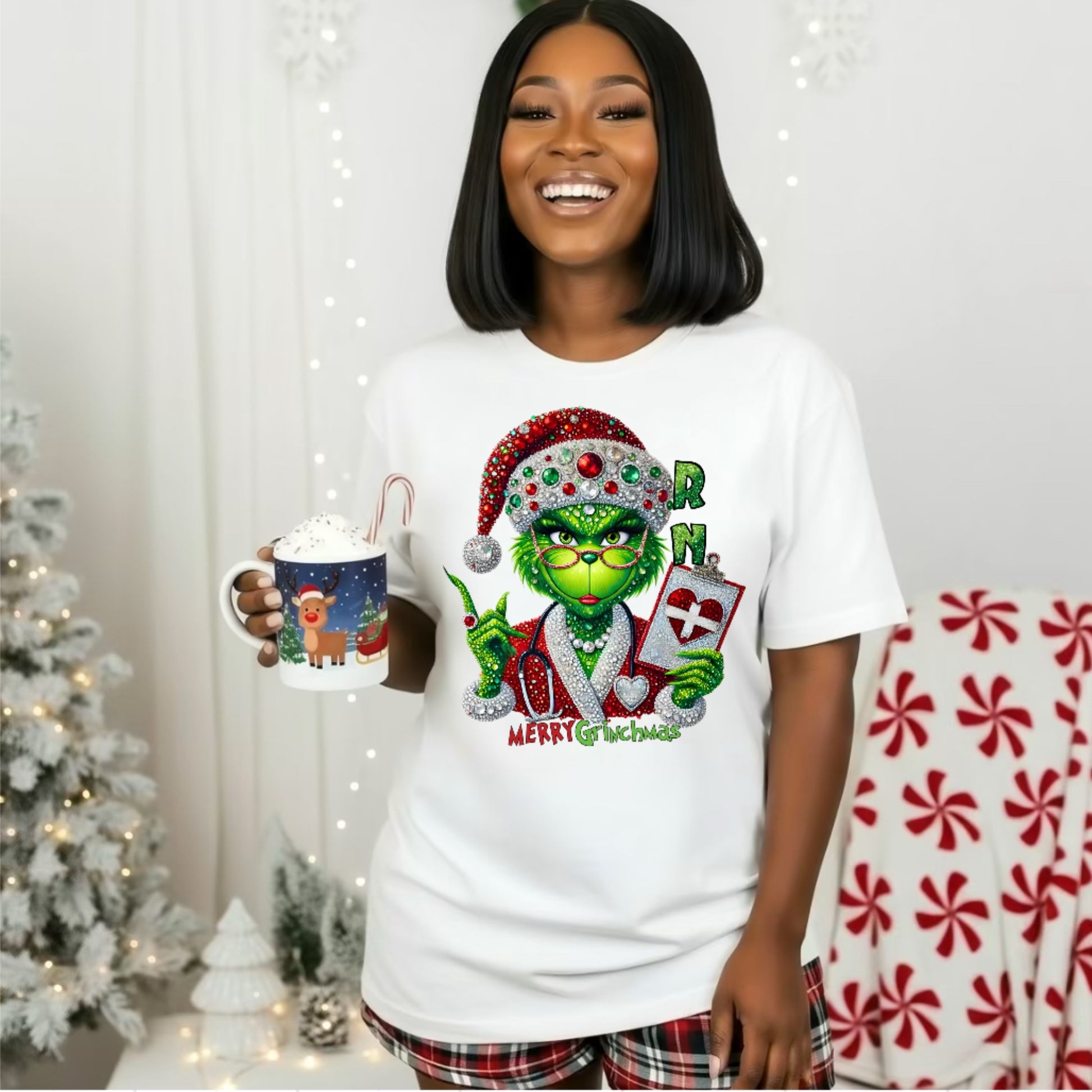 Merry Grinchmas (RN) Tee. Unisex soft style 100% cotton white Tee, if you prefer a more fitted shirt, sizing down a size is recommended