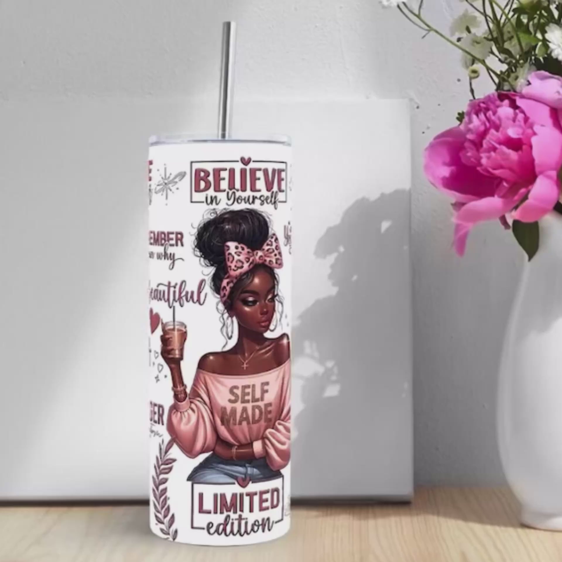 Self Made 3D 20oz Stainless Steel double wall insulated tumbler with lid and stainless steel straw. Keeps drinks cold for 12 hours and hot for 8 hours.