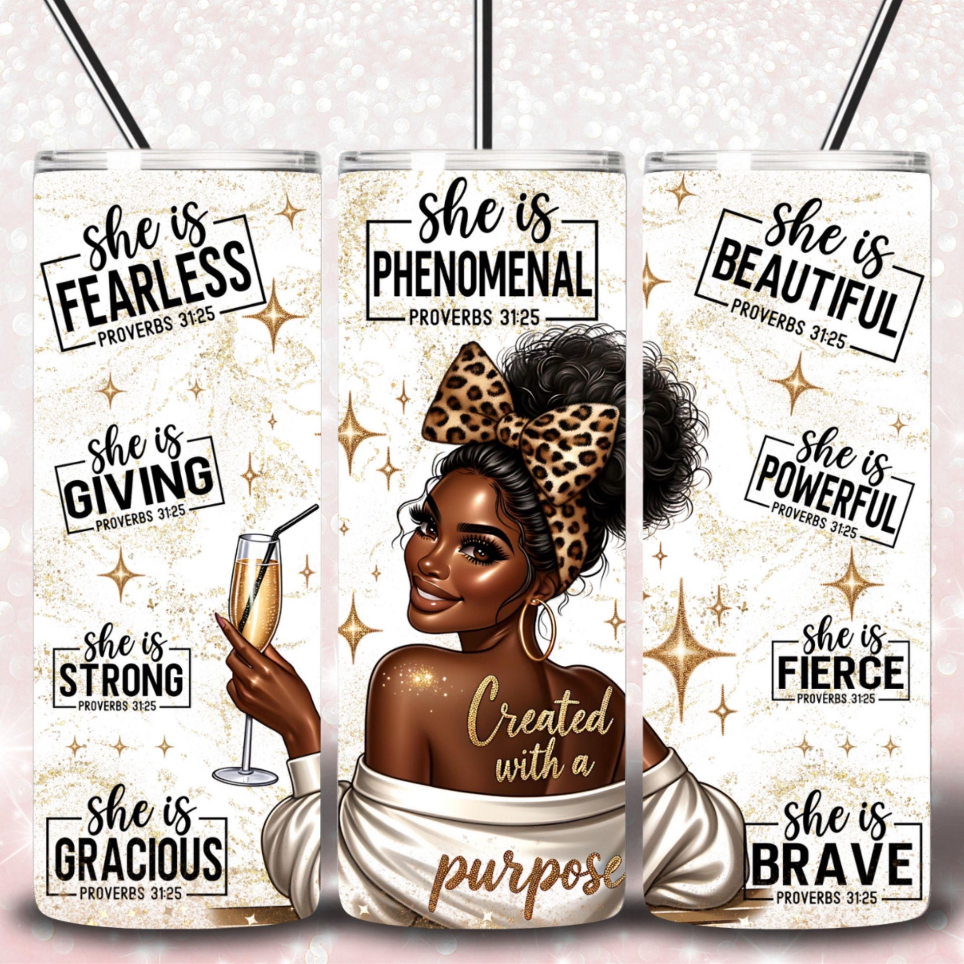 She is phenomenal 3D Tumbler. 20oz Stainless Steel double wall insulated tumbler with lid and straw. Keeps drinks cold for 12 hours and hot for 8 hours.