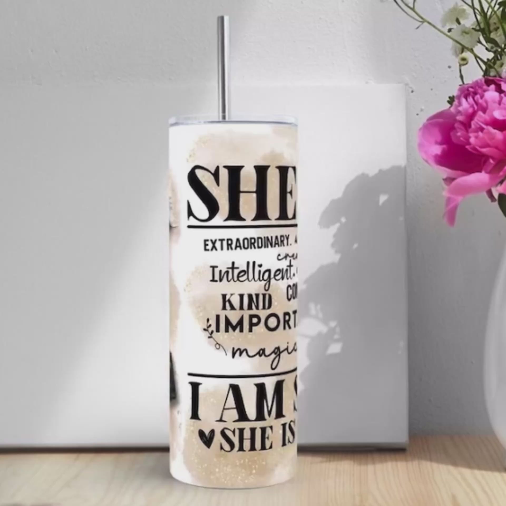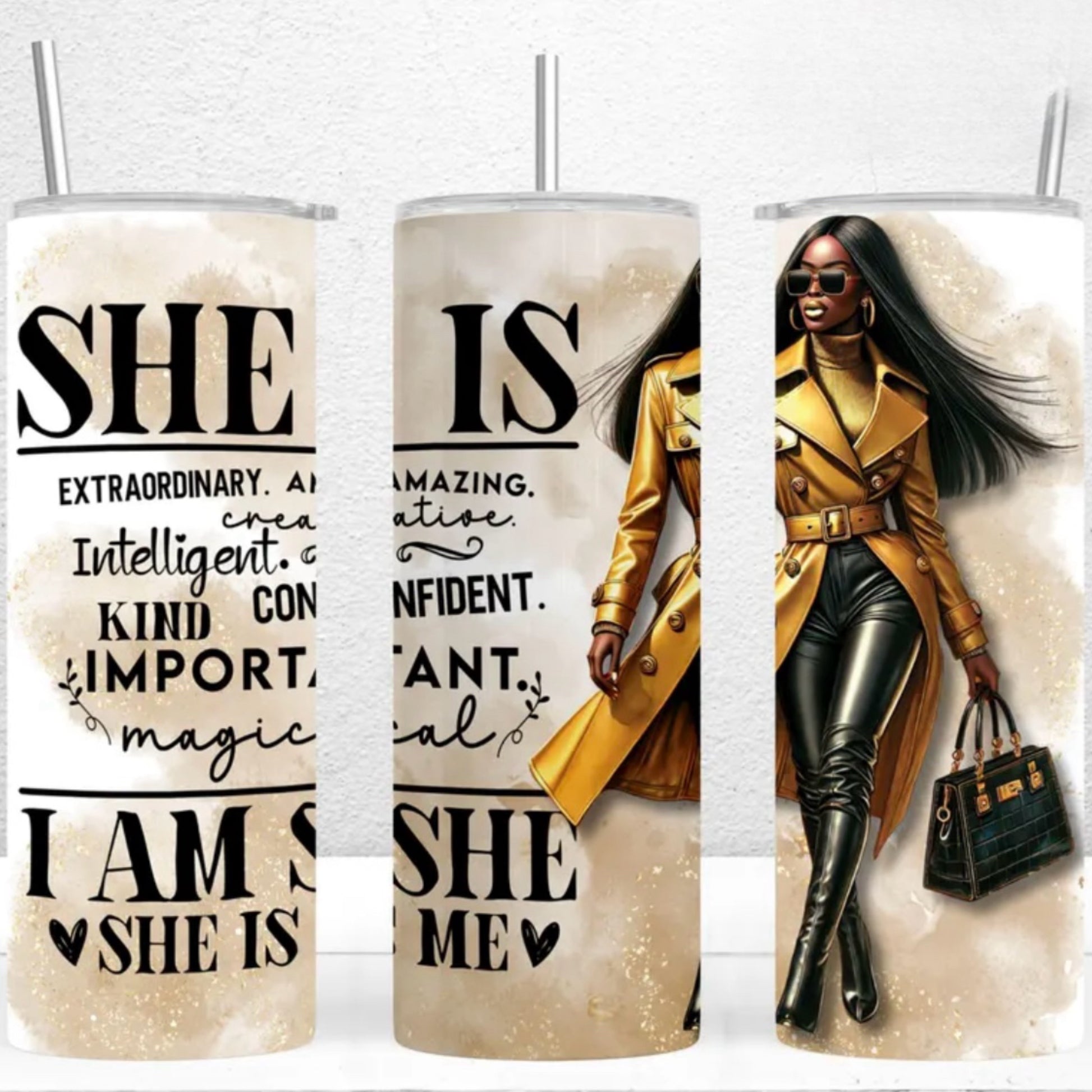 She Is 3D 20oz Stainless Steel double wall insulated tumbler with lid and stainless steel straw. Keeps drinks cold for 12 hours and hot for 8 hours.