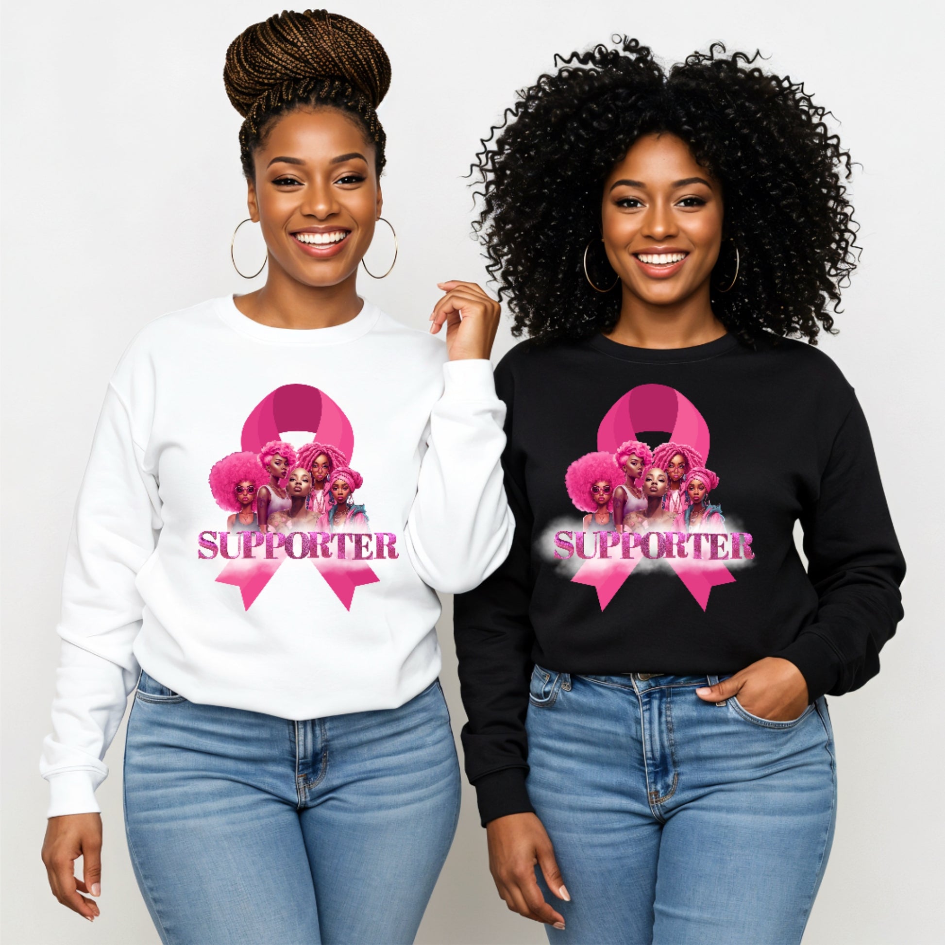 Supporter Breast Cancer Awareness Sweater customized using Gildan brand Adult Heavy Blend Fleece Crew offers ultimate comfort and durability. Crafted from a 50/50 blend of cotton and polyester, this 8 oz. fleece crew features a tear-away label, pill-resistant air jet yarn, and double-needle stitching. Available in black or white color.